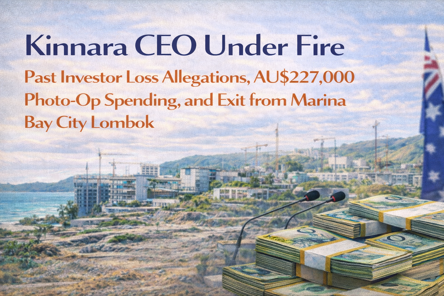 Questions are intensifying around Kinnara CEO Adrian Campbell as controversy grows over his leadership history, allegations tied to past investor losses estimated at up to AU$23 million, and spending decisions that critics claim prioritised optics over substance during Kinnara’s involvement in the Marina Bay City Lombok development.